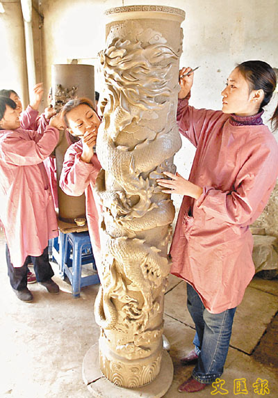 陶藝工人在陶胎上進行大型浮雕雕刻。黑陶藝術是中華遠古「龍山文化」的象徵,擁有數千年的歷史。天津女青年劉影在一次偶然的機會中接觸到黑陶藝術並為此痴迷。2003年,她投資建成了天津第一家黑陶窯。目前,她們開發研製的黑陶藝術精品遠銷海外。新華社