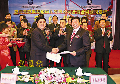 青島港集團的董事局主席、總裁常德傳(前排右)與威海港集團簽約合資經營青威集裝箱碼頭項目。 本報通訊員攝