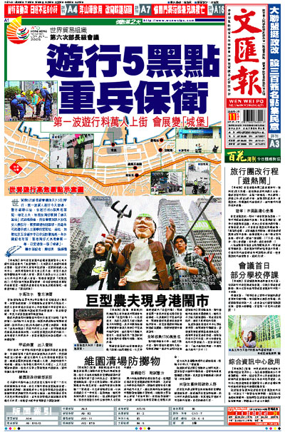 世貿第6次部長級會議後天(13日)舉行,第一波萬人遊行今天登場,警方嚴陣以待,在遊行的5個高危黑點,做足工夫,包括在灣仔展開「鋪天蓋地」式終極檢查,而在會展加派大批保安人員駐守,氣氛顯得特別緊張。而最有可能遭示威人士衝擊的變電站、油站、加氣站及五金舖亦早已作出防禦措施。有外國記者形容:香港灣仔尤其是會展一帶,已變得像一個「城堡」。