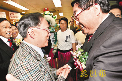 為慶祝主席劉皇發獲特區政府頒授大紫荊勳章,鄉議局昨晚於元朗大球場舉行「千圍宴」,有近2萬名嘉賓到場,包括行政長官曾蔭權(左二)及中聯辦主任高祀仁。圖中曾蔭權正要離開,高主任剛好抵達,兩人立刻親切握手問好。左一為劉皇發。本報記者葉傲冬 攝