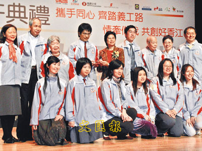昨日的嘉許禮主要表揚熱心參與義工服務的公眾團體、私人企業,及向個人最高服務時數及連續服務20年以上的義工人士頒發獎狀。個人得獎年紀最大的是96歲的余佩英婆婆,做義工超過20年。余婆婆說,最初做義工時幫忙捲棉花球,後來由紅十字會出冷線,讓她織圍巾送給窮人,20多年來每個月都做2至3日,風雨不改。對於獲得嘉許,余婆婆感到十分高興,雖然年紀大,但以後還是會繼續做義工服務。社署社會工作主任曾國雄表示,近年義工人數不斷穩步增長,現時全港登記義工人數已超過52萬人,比去年的43萬上升近26%,情況令人鼓舞。未來除了青少年、社團組織外,社署亦會加強企業義工的推廣,希望私人企業能以本身專長服務大眾。