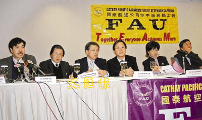 國泰航空公司空中服務員工會昨與香港醫學會及立法會議員召開記者會,投訴公司要求員工公開過往的病歷紀錄。 本報記者鄧愷欣 攝