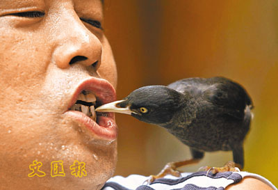 ■陝西省西安市,有一隻鳥會為主人清潔牙齒。這位李姓主人說,這隻鳥聰明異常,所以一直將牠帶在身邊。 路透社