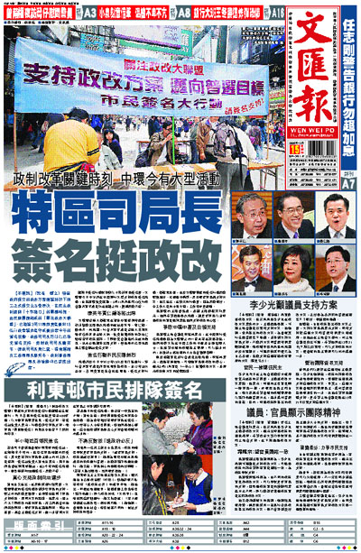 繼周日簽名行動取得數以十萬計市民簽名後,大聯盟今日中午將在中環舉行大型支持政改簽名活動,由民建聯負責統籌,3司11局局長和15位行政會議非官守成員均在邀請之列,據稱反應不俗。
