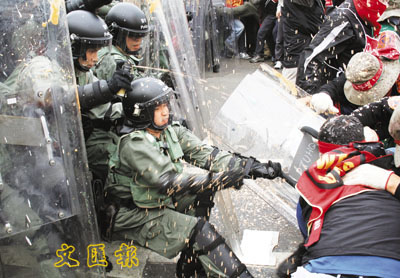 【本報訊】(記者 聶曉輝)本港防暴警察在經過反對世貿的韓國農民前天的「試探式衝擊」後,並未及時作出相應的應對安排。相反昨日中午近百名韓國農民的衝擊則更具組織性及策略。在灣仔北示威區的六度「交鋒」中,警方防線儘管未被衝破,卻被示威者搶去十多面盾牌。一名警員更被扯出防衛陣外;警方再次出動胡椒噴霧,才不致失陷。示威者離開時更留下一句說話:「See you tomorrow(明天見)!」。