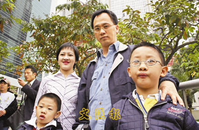 從新加坡來的陳先生特地帶同兩名兒子前往觀看示威活動。本報記者聶曉輝 攝