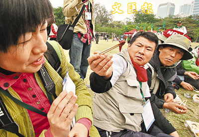 示威韓農請記者吃辣椒泡菜,記者嚇得花容失色。本報記者羅蘭蓉 攝