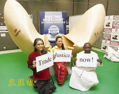 ■會場內來自亞非國家的人士,站在一個巨型的破碎曲奇模型前,手持寫著「立即落實公正貿易」的橫額抗議。 法新社