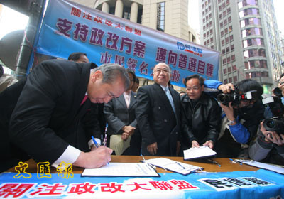李國寶、廖長城簽名,投下信任的一票。本報記者 羅蘭蓉 攝