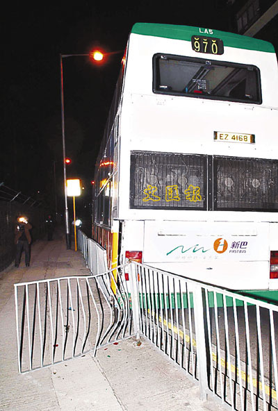 遭偷駕後撞毀鐵欄的其中一輛新巴。