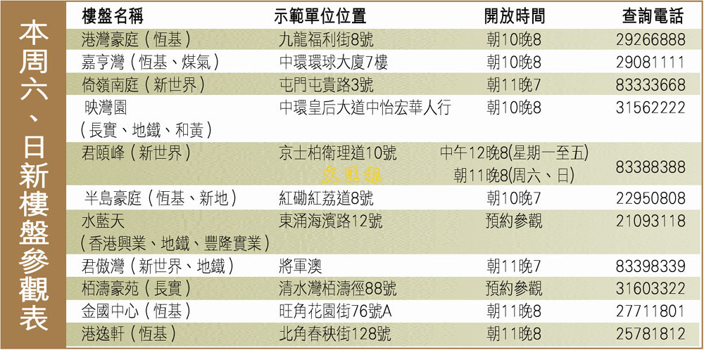 本周六、日新樓盤參觀表 (圖)