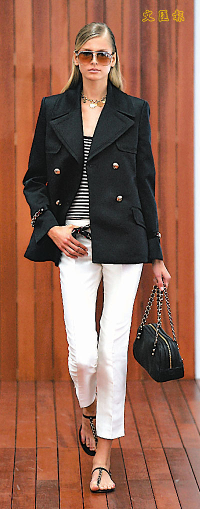 黑白色橫間top,加件黑色外套及穿著白色長褲,這個款式是值得注意的生力軍,適合外遊時穿著。