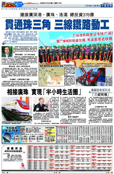 總投資376.5億元人民幣的廣深港(廣州-深圳-香港)鐵路客運專線、廣珠(廣州-珠海)城際軌道交通、洛湛(洛陽-湛江)鐵路通道岑溪至茂名段鐵路今日在深圳、珠海、信宜三地同時開工,這標誌著廣東鐵路建設全面加速,同時也標誌著中國鐵路跨越式發展在廣東邁出了重要步伐。