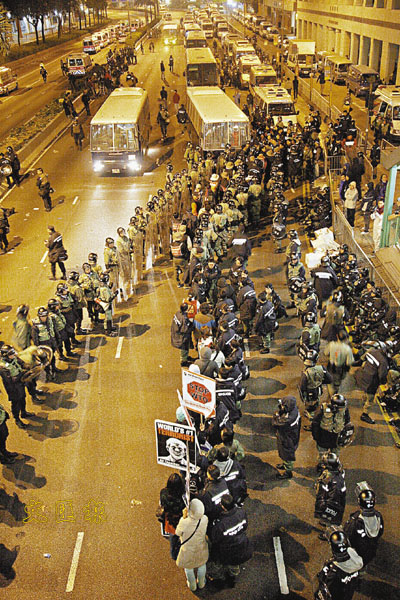 世貿的不平等協議,激發來自南韓、台灣和印尼的示威者不滿,前日衝破警方防線直逼世貿會場的會展中心,在告士打道與警方爆發激烈衝突,受傷人數達135人,涉及61名警員,當中10名女警;傷者中3人留醫、1人嚴重、其餘2人情況穩定。警方自昨日凌晨2時50分起用揚聲器以韓語、英語和廣東話廣播,稱示威者非法集會,會被警方拘捕。