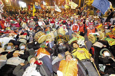 一批韓農示威者於暴亂後,躺在地上休息。 本報記者張立新 攝