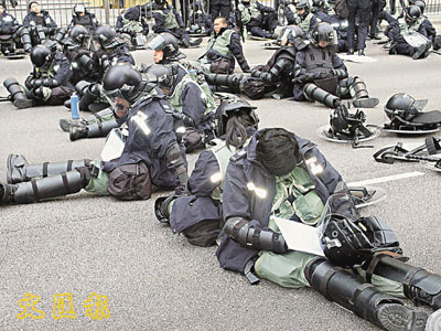 ■港警經過通宵與反世貿示威者對歭後,分批休息,許多警員坐在地上立刻睡著。中央社