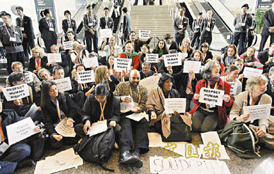 ■會場內一批聲援被捕韓國農民的與會人士,在大堂靜坐示威,要求港府盡快釋放有關人士。法新社