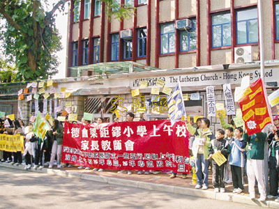 ■300名沙田路德會梁鉅鏐小學的校長、家長及師生到路德會總部示威,以表示不滿兩校合併。 實習記者梁啟剛 攝