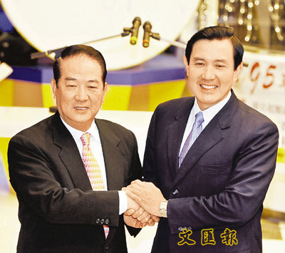 ■馬英九與宋楚瑜昨日在青少年育樂中心二度會面,達成國親新三位一題的共識。 路透社