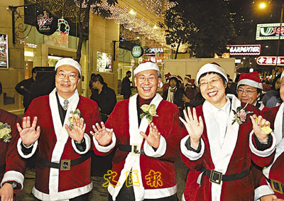【本報訊】(記者 郝君兒)繼日前開始展開免費循環線穿梭巴士服務及聖誕老人派發禮物等措施後,灣仔駱克道有「酒吧街」之稱的盧押道至芬域街一帶商戶,亦聯同民建聯發起自救行動,由昨晚開始一連兩日在街頭售賣酒水美食,冀藉聖誕節吸引更多人流,補償上星期因世貿會議舉行而受到的損失。政務司司長許仕仁更應邀以聖誕老人打扮出席開幕儀式,他感謝市民體諒世貿帶來的不便,並呼籲市民到區內消費。