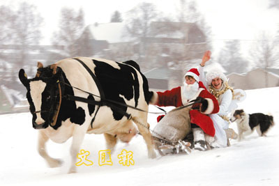 ■傳統中,聖誕老人由鹿拖車(雪橇)去派禮物。但德國東部一小鎮卻大膽起用乳牛「拉妮娜」去展身手,拖著聖誕老人和天使飛奔,跑得比狗還快。 (法新社)