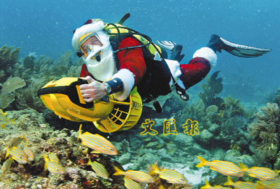 ■佛羅里達州的聖誕老人為兒童收容所籌款,不惜冒寒在水底騎電動滑板,與捐款者合照。(美聯社)