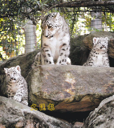 ■悉尼動物園與法德兩國經過兩年合作,終於「炮製」出圖中兩頭雙胞胎雪豹。如今,小雪豹已有八周大,頑皮得很,豹媽媽(中)寸步不離。(法新社)