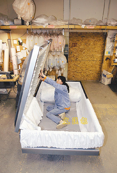 ■美國肥人愈來愈多,為迎合市場需要,印地安那州一棺材舖今年特別製造了近800副闊度由29吋至52吋的超級棺材,讓體重達250磅至300磅肥人安寢無憂。(法新社)