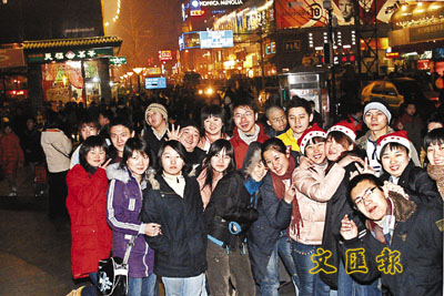 ■平安夜,北京年輕人在王府井商業街過佳節。 中新社