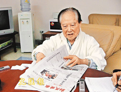 ■海協會會長汪道涵24日病逝上海瑞金醫院。圖為汪道涵今年1月3日在上海醫院接受媒體採訪時,建議記者閱讀上海《新民晚報》一篇評論辜振甫的文章。 中央社