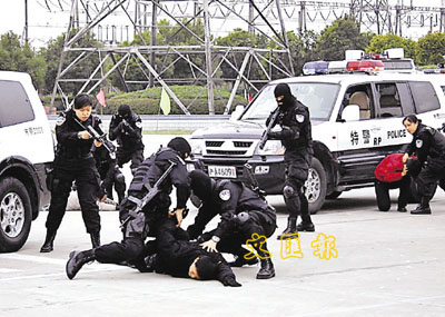 ■24日,上海市公安局特警總隊宣告成立,特警隊員在培訓基地進行多個訓練科目的匯報演練。上海市公安局特警總隊主要承擔反恐防暴、打擊劫持人質等嚴重暴力犯罪和處置群體性突發事件等特殊任務。 新華社
