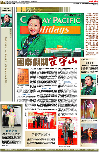 遇見霍宇山,她已離開太古糖業,被調任至國泰假期當董事總經理。那天,國泰假期推出全新的特色旅行團「靈感之旅」,找來蔡瀾推介首爾和北海道的景點。跟霍宇山談了一會,只見她對答如流,想不到她的旅遊業經驗,只有三個月。三個月?腦裡閃出一大個問號,覺得半信半疑,但翻查資料,確實又屬事實。別人覺得驚訝,霍宇山卻處之泰然,畢竟「三個月就學會」,已非第一次。
