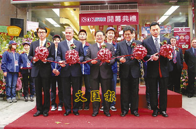 OK便利店在本港和內地有近300分店,新店在港開幕,大老闆馮國經(前排中)抽空出席剪綵。