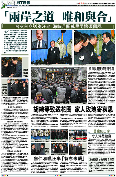 12月的上海巨星隕落,昨天海內外人士在此間相聚,送別海峽兩岸關係協會會長汪道涵。上海龍華殯儀館大廳昨天莊嚴肅穆,大廳門楣上方懸有黑色橫幅,上書:「為汪道涵先生送行」,兩邊的輓聯上寫著:申江水闊百年初現鴻圖願,海峽月圓萬里同懷碩儒風。數百隻潔白的花圈環繞於大廳內外,汪老遺體靜臥於靈台上,白色和粉色的鮮花簇擁著他,老人安詳的表情,一如大廳正中巨幅遺像上那般鶴髮童顏。