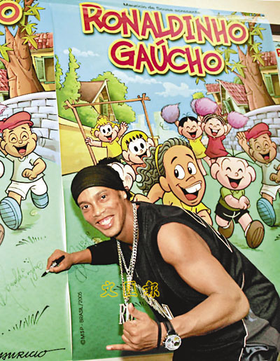 今年榮膺「雙料足球先生」的巴西球星朗拿甸奴,日前趁西甲賽事歇冬期間返回祖國,在巴西南部城市為一本以自己為題材的漫畫《Ronaldinho Gaucho》進行宣傳。圖為朗拿甸奴與漫畫中的朗拿甸奴合照。 路透社