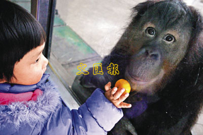 南京市大批市民元旦帶同子女遊覽動物園,圖為一名女童在動物園內向大猩猩展示橘子。 路透社