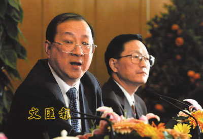 ■2005年3月9日,財政部部長金人慶(左)、稅務總局局長謝旭人回答記者提問。 資料圖片