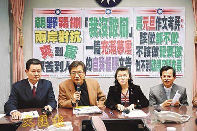 ■針對陳水扁在元旦文告中的兩岸關係發言,藍營立委李慶華 (左二)等人昨日舉行記者會,一同炮轟。 中央社