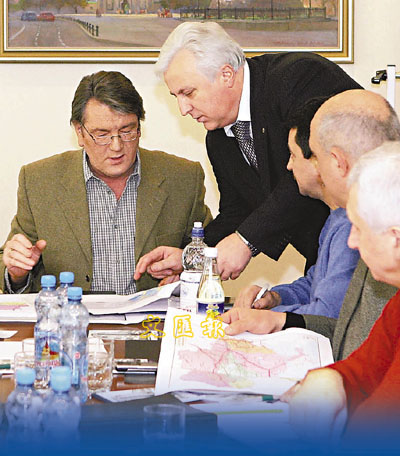 ■烏克蘭總統尤先科(左)在國營油氣公司召開緊急會議,向屬下官員徵求意見。 法新社