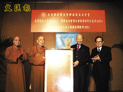 ■覺光長老(左二)向副會長黎時煖居士(右二)致送賀匾。左一為智慧長老,右一為區潔名居士。 本報記者梁曉睿 攝