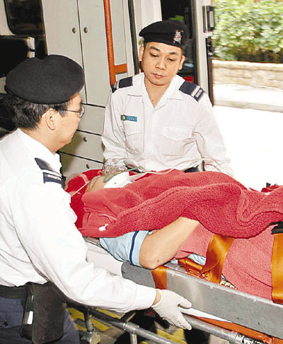 工人抹窗期間不慎墮樓受傷,須由救護員送院。
