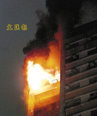油麻地恩佳大廈天台發生三級大火及爆炸,火光熊熊。 本報記者鄺福強 攝