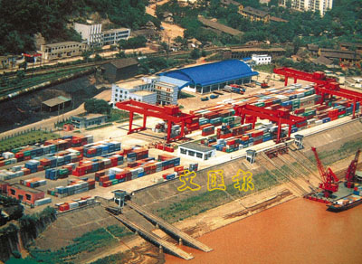 ■由於長江上的部分橋樑設計欠佳,部分大型船舶難以駛向上游,使得上游部分港口吃不飽。圖為重慶最大的集裝箱碼頭九龍坡港。