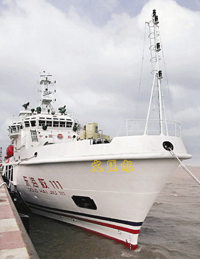 ■5日,新型專用救助船「東海救111」停靠在上海港外高橋碼頭。該救助船將投入東海海域救助行列,可以安置100名獲救人員。 新華社