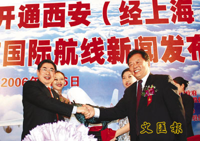 ■陝西省委副書記、西安市委書記袁純清(左)和東方航空集團總裁李豐華在新聞發布會上互道祝賀。 林雁 攝