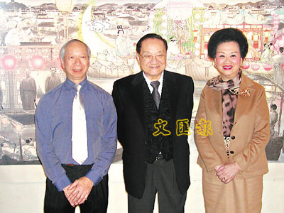 ■董培新(左)、查良鏞(中)及精藝軒董事長梁潔華於畫展開幕酒會