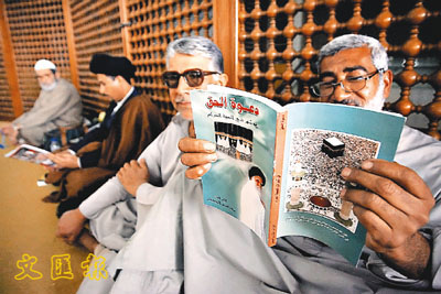 ■往聖城麥加的信眾已整裝待發,在等飛機的時候,朝聖者不忘看有關聖城的書籍解悶。 法新社