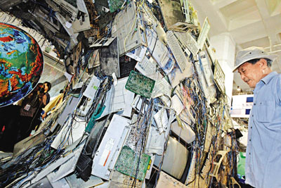 ■綠色和平組織在一個國際高科技展覽上,展出一座電子廢料雕塑,藉以譏諷參展公司。 資料圖片