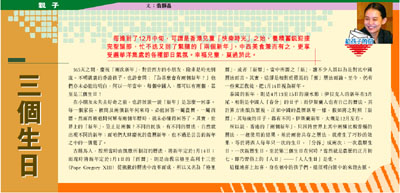 365天之間,慶祝「兩次新年」,對於西方的小朋友,除非是時光倒流。不明就裡的香港孩子,也許會問︰「為甚麼會有兩個新年?」他們亦未必能的明白,何以一年當中,每個中國人,都可以有兩個,甚至是三個生日!