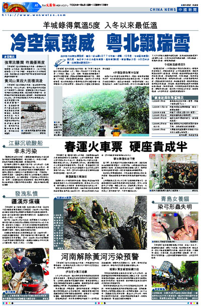 【本報訊】據中新社廣州8日消息:隨「小寒」而至的強冷空氣正在發威。5日,粵北一些地區下了今年第一場雪,7日早晨,連山、仁化、始興、樂昌等4個市縣發佈了黑色寒冷預警信號,其餘84個市縣都相繼亮起了紅、黃信號。7日早晨,羊城最低氣溫5攝氏度,為去年入冬以來最低氣溫。廣州市氣象台6日發佈的紅色寒冷預警信號一直持續到7日上午仍未解除,也是去年入冬後廣州首個紅色寒冷預警。